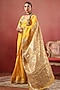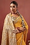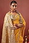 Featuring a yellow saree in chanderi base with gota patti and threadwork. It is paired with an embroidered blouse piece. Accentuate it with statement jewellery and embellished heels for a wedding, sangeet or engagement ceremony.