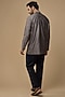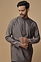 Featuring a dark grey short kurta in cotton silk base with embroidery. Perfect wear for a puja ceremony or a casual outing.