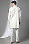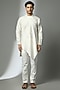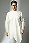 Featuring an ivory kurta in silk satin base. Style it with pants and kolhapuri sandals for a festive occasion or pooja ceremony.