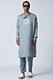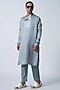Featuring a light blue kurta in muga silk and organza base. Style it with pants and kolhapuri sandals for a festive occasion or intimate pooja ceremony, exuding charm and elegance.