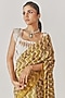 Featuring an ochre yellow saree in muslin silk base with chevron print and an organza border. It is paired with an off-white embroidered blouse. Accentuate it with statement jewellery and heels for weddings or festive occasions.