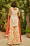 Featuring an orange top in chinon, muslin silk and cotton base with tie-dye print and hand embroidery. It is paired with matching layered sharara pants and a dupatta.