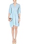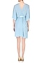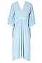 Featuring a sky blue V neck draped dress in stretch knit base appliqued with black sequins at the centre front. It has ruffled up detailing at either end.