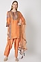 Featuring a peach kurta in silk base with embroidery. It is paired with matching salwar pants having print and a net dupatta.