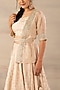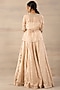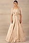 Featuring a light peach lehenga in bamberg silk base with embroidery. It is paired with a matching jacket in organza base, an inner, and a belt.
