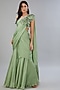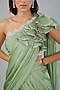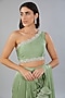 Featuring a green draped saree in satin georgette base. It is paired with a one-shoulder blouse. Perfect wear for cocktail events.