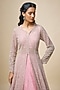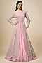 Featuring a blush pink jacket in net and organza base with hand embroidery. It is paired with a blouse and a skirt. Accentuate it with kundan polki jewellery and block heels for weddings or sangeet ceremony.