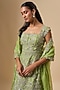 Featuring a chutney green kurta in organza base with 3D zari hand and machine embroidery. It is paired with sharara pants and a dupatta. Style it with statement jewellery, soft curls and block heels for weddings or mehendi ceremonies.