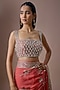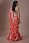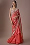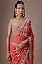 Anushree Reddy features a coral ruffled saree in chiffon and organza base. It is paired with a blouse. Style this designer set with meenakari jewellery, an embellished clutch bag and block heels, perfect for a festive celebrations or sangeet ceremony.