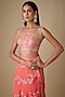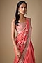 Featuring a coral ruffled saree in organza and chiffon base with aari hand and machine embroidery. It is paired with a blouse. Accentuate with pearl jewellery and block heels for sangeet, engagement ceremonies or weddings.