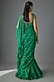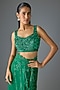 Featuring an emerald green ruffled saree in net base with cutdana, sequins hand and machine embroidery. It is paired with a blouse. Accentuate with pearl jewellery and block heels for mehendi, engagement ceremonies or weddings.
