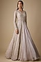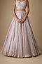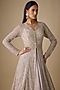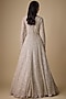 Featuring an ivory jacket in net and organza base with hand embroidery. It is paired with a skirt and a blouse. Accentuate with polki earrings and block heels for sangeet ceremonies or weddings.