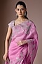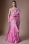 Featuring a lotus pink draped ruffled saree in organza base with embroidery. It is paired with an embroidered blouse. Style it with statement diamond jewellery, a sleek bun and gold heels for weddings, festive celebrations, cocktail evenings or reception functions.