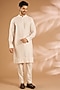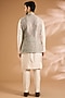 Featuring an ash grey nehru jacket in raw silk base. It is paired with a kurta, pants and a pocket square. Style it up with mojaris and malas for a wedding, sangeet or engagement ceremony.