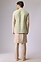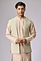 Featuring a cream-mint indowestern in raw silk base. It is paired with a kurta and pants. Style it with a pair of mojaris for a wedding, sangeet or engagement ceremony, exuding charm and elegance.