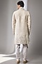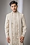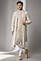 Featuring an ivory sherwani in raw silk base with embroidery. It is paired with a kurta, pants, a stole and a pocket square. Style it with a pair of mojaris and a safa for your wedding, engagement or sangeet ceremony, exuding traditional charm and elegance.