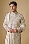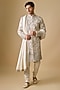 Featuring an ivory sherwani in silk base with embroidery. It is paired with a kurta, pants, a stole and a pocket square. Style it with a safa, pair of mojaris and a mala for your wedding, engagement or sangeet ceremony, exuding traditional charm and elegance.