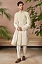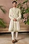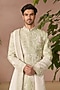 Featuring a mint green sherwani in raw silk base. It is paired with a kurta, pants, pocket square and a stole. Style it with a mala, safa and pair of mojaris for a traditional look, Perfect attire for your wedding, engagement or sangeet ceremony.