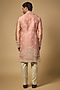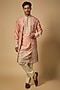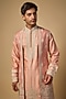 Featuring a peach long open jacket in raw silk base with embroidery. It is paired with a kurta and pants. Style it with a pair of mojaris and some accessories for a complete traditional look.