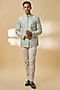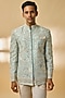Featuring a powder blue bandhgala in raw silk base. It is paired with a shirt, pants and a pocket square. Perfect for a wedding, sangeet or engagement ceremony, exuding charm and elegance.