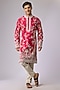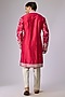 Featuring a red kurta in chanderi base. It is paired with pants. Style it with a pair of kolhapuri sandals for a festive occasion, wedding or engagement ceremony, exuding charm and elegance.