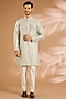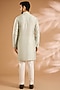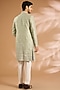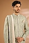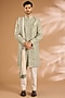 Featuring a sage green sherwani in raw silk base. It is paired with a kurta, pants, a stole and a pocket square. Style it up with mojaris, safa and malas for a wedding or engagement ceremony.