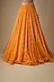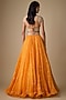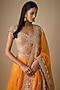 Featuring an orange lehenga in organza base with hand embroidery. It is paired with a blouse and a dupatta. Accentuate with polki earrings and block heels for sangeet, haldi ceremonies or weddings.