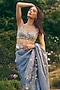 Featuring a powder blue ruffled saree in organza base with embroidery. It is paired with an embroidered blouse. Style it with statement emerald or kundan jewellery, a sleek bun and gold heels for weddings, festive celebrations, cocktail evenings, or reception functions.