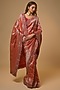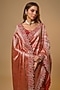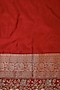 Featuring a red saree in banarasi silk base with zardosi work. It is paired with an unstitched blouse piece. Accentuate it with pearl jewellery and heels for a graceful look, perfect for daytime weddings, festive gatherings, poojas or elegant family celebrations.