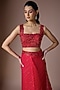 Featuring a red draped ruffled saree in chiffon and organza base with sequins hand embroidery. It is paired with a blouse. Style it with statement emerald jewellery, a sleek bun and gold heels for weddings, festive celebrations, cocktail evenings or reception functions.