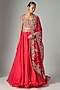 Featuring a red lehenga in organza base. It is paired with a blouse and a dupatta. Accentuate it with statement earrings and heels for weddings or sangeet ceremony.