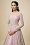 Featuring a rose pink jacket in net and organza base with hand embroidery. It is paired with a blouse and a skirt. Accentuate it with kundan polki jewellery and block heels for weddings or sangeet ceremony.