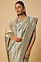 Featuring a sea blue saree in banarasi silk base with zardosi hand embroidery. It is paired with an unstitched blouse. Accentuate the designer saree with silver or swarovski jewellery, embellished heels and a potli bag for a bridal look, Perfect for a wedding, sangeet or engagement ceremony.
