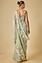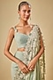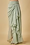Featuring a sea blue cape in chiffon base with cutdana hand embroidery. It is paired with a blouse and a skirt. Accentuate it with statement jewellery and heels for festive occasions or wedding ceremony.