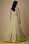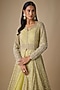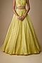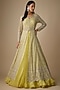 Featuring a yellow jacket in net and organza base with hand embroidery. It is paired with a skirt and a blouse. Accentuate with polki earrings and block heels for haldi ceremonies or weddings.