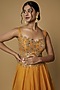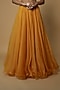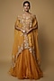 Featuring a yellow cape in organza base with sequins detail. It is paired with a matching blouse and a skirt.