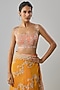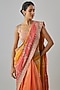 Featuring a yellow and peach leheriya ruffled saree in chiffon and organza base with hand and machine embroidery. It is paired with an unstitched blouse piece. Accentuate it with diamond jewellery and block heels for wedding ceremony or festive occasions.