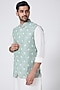 Featuring a beryl green bundi jacket in raw silk base with cord embroidery. It is paired with a contrasting asymmetrical kurta in spun silk base and trousers.
