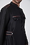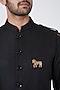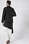 Featuring a black bundi jacket in terry wool base with zardosi work. It is paired with a contrasting asymmetrical kurta in spun silk base and trousers.