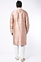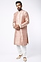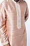 Featuring a deep oyster kurta in raw silk base with cord work. It is paired with contrasting spun silk trousers.