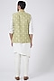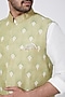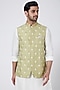 Featuring an oasis green bundi jacket in raw silk base with buttis and cord embroidery. This contains only one piece.