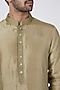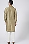Featuring an olive green kurta in dupion silk base. It is paired with contrasting trousers in spun silk base having a cotton lining.