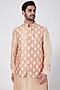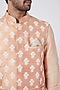 Featuring an oyster peach bundi jacket in raw silk base with buttis cord work. This contains only one piece.