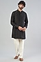 Featuring a black shirt kurta in dupion silk base with concealed buttons. It is paired with contrasting spun silk tapered pants.