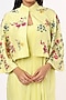 Featuring a yellow dress in crepe silk base. It is paired with a matching dupion silk floral embroidered jacket.