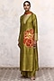 Featuring a green kurta in raw silk base with hand embroidery. It is paired with matching raw silk trousers and an organza dupatta.