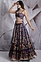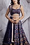 Featuring a blue lehenga in raw silk base with floral and geomertric digital print, including floral motifs and pearl borders. It is paired with a matching blouse, an embellished belt, and a net dupatta.