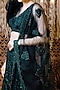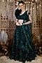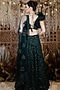 Featuring an emerald green lehenga in net base with resham and thread embroidery including kundan highlights. It is paired with a matching organza ruffled blouse and a net embellished dupatta.