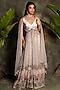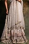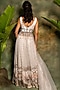 Featuring an ivory anarkali in georgette base with motifs, including gold kasab thread and mirror embellishments. It is paired with palazzo pants and a sheer net dupatta. Accentuate it with statement earrings and heels for sangeet ceremonies.