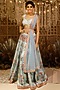Featuring a light blue lehenga in raw silk base with floral digital print. It is paired with a matching blouse having gold borders, a tasseled belt, and a soft net dupatta.